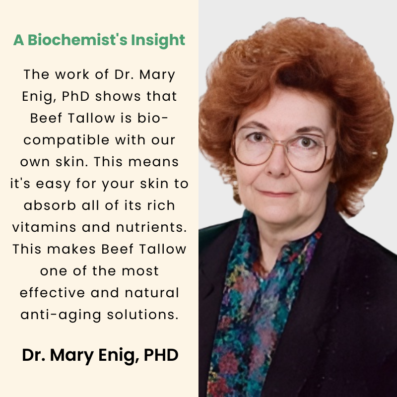 Research of Dr Enig is the reason why our balm delivers such a great results. Her work showed that grass-fed beef tallow is full of vitamins and anti-aging nutrients. It also showed that tallow is bio-compatible with your skin.